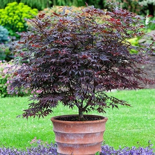 Acer palmatum ‘Atropurpureum’ – classic deep burgundy-purple leaves that turn an even more brilliant shade of bright red in autumn. H to 4m but restricted to 1.5m (approx.) in a pot.
