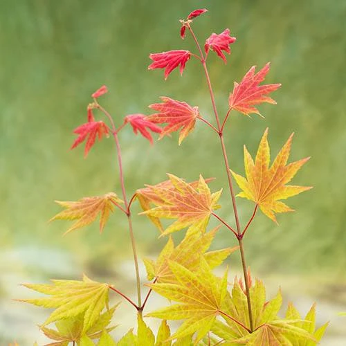 The palm-shaped leaves are sharply-toothed and emerge bright-red when young, maturing to a fresh yellow-green before turning orange and red in the autumn – making a colourful kaleidoscope of colour in the garden.