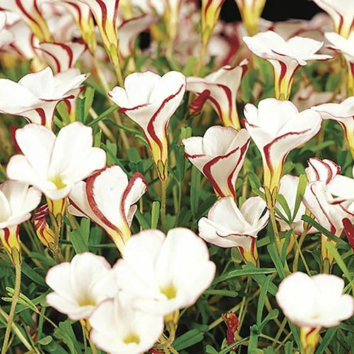 Stunning when in full bloom, the flowers are even more striking when in bud and marked with vivid crimson-pink stripes, hence its common name, the ‘Candy Cane Sorrel’. This delightful little plant is something uniquely special, with its bright white, funnel-shaped flowers edged with colour.