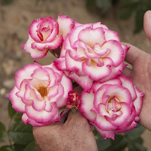 Simply spectacular! Delightfully unusual single flowers with creamy-white andย deep rose-pink edged petals and a pollen rich centre smother this brilliant, vigorous climber in a stunning season long show.