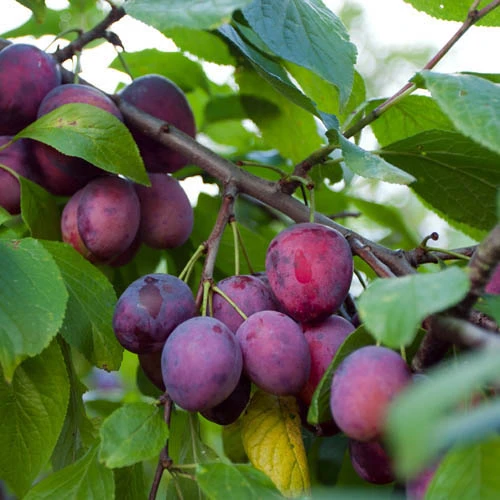 Plum ‘Czar’ – This popular variety boasts a display of pretty, dark-blue fruits that look remarkable when ripening on trees around August each year. The delicious fruits are soon followed by attractive and fragrant white blossoms, growing to create a spectacle in the summer. The fruits can be left on the tree to mature even longer, obtaining a dark and richer colour, while softening in flavour and gaining a certain sweetness.