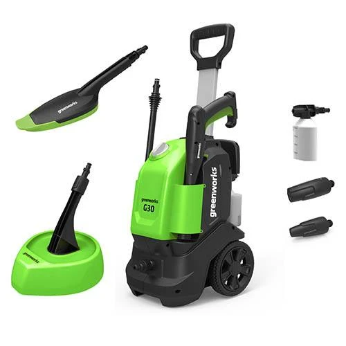 Small, lightweight but powerful, the Greenworks 1500w pressure washer is ideal for quick cleaning tasks around the home and garden. With the integrated handle & transport wheels it is easy to move this machine from location to location. The washer is supplied with a high pressure hose and 6 metre power cable. It also benefits from delivering up to 120 bar max pressure so perfect for your home cleaning jobs.