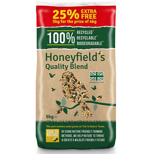 Where the ingredients allow, Honeyfield?s wild bird foods contain cereals and other seeds grown on Fair to Nature farms. These farms grow special areas of seed-bearing crops to provide food for farmland bird species, such as linnets, skylarks, and buntings as well as providing habitats for a host of other wildlife. This means that Honeyfield?s wild bird food not only feeds the birds in your garden, it looks after the wild birds and wildlife in our countryside too.