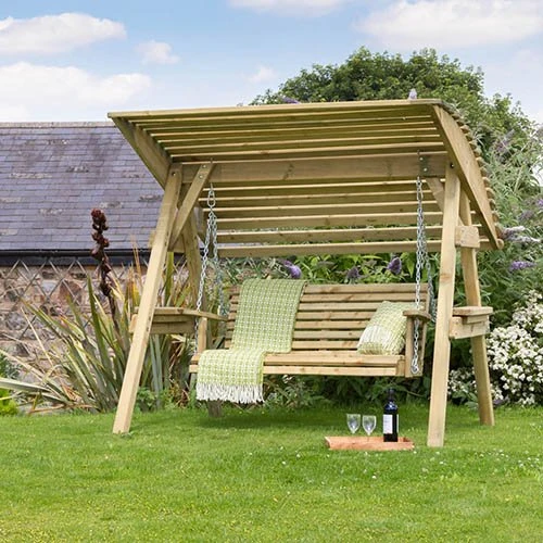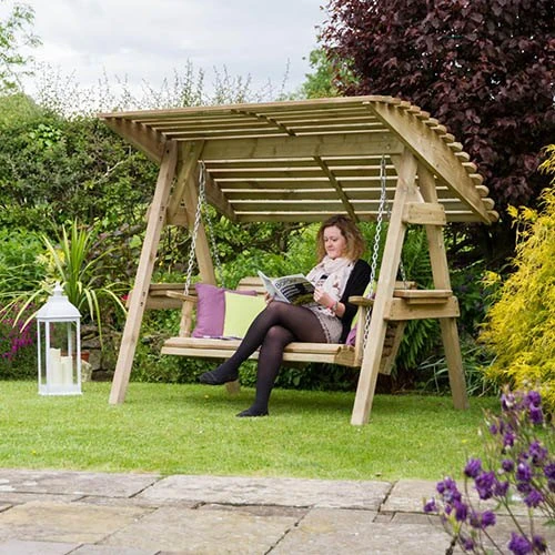 A luxurious swing seat for the garden, complete with a wooden fixed canopy. The Miami Swing can comfortably seat up to two people and has two removable shelves that easily slot onto the swing’s armrests – perfect for summertime drinks.