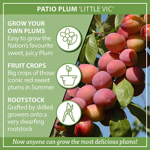 Perfect in large patio pots (minimum 30cm diameter) for 5 years or so, it produces big, juicy crops of classic red Victoria Plums, yet stays small, manageable, and perfect for everyone.
