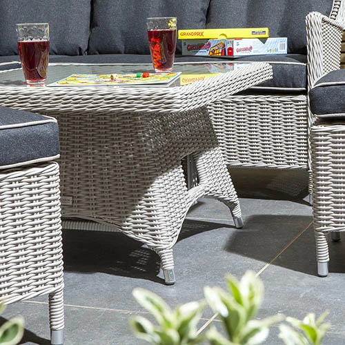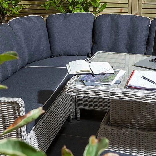 Welcome to a world of contemporary casual dining with this stunning corner dining/entertaining set which comfortably sits six people. Coming with the added benefit of having seat and back cushions and a height adjustable table, this is a perfect set for whiling away the hours with family or friends alike.