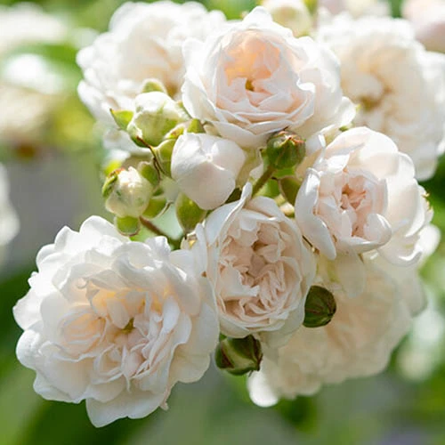 Rosa ‘The Fairy White’ produces a cascade of delicate white, double blooms with an open centre.